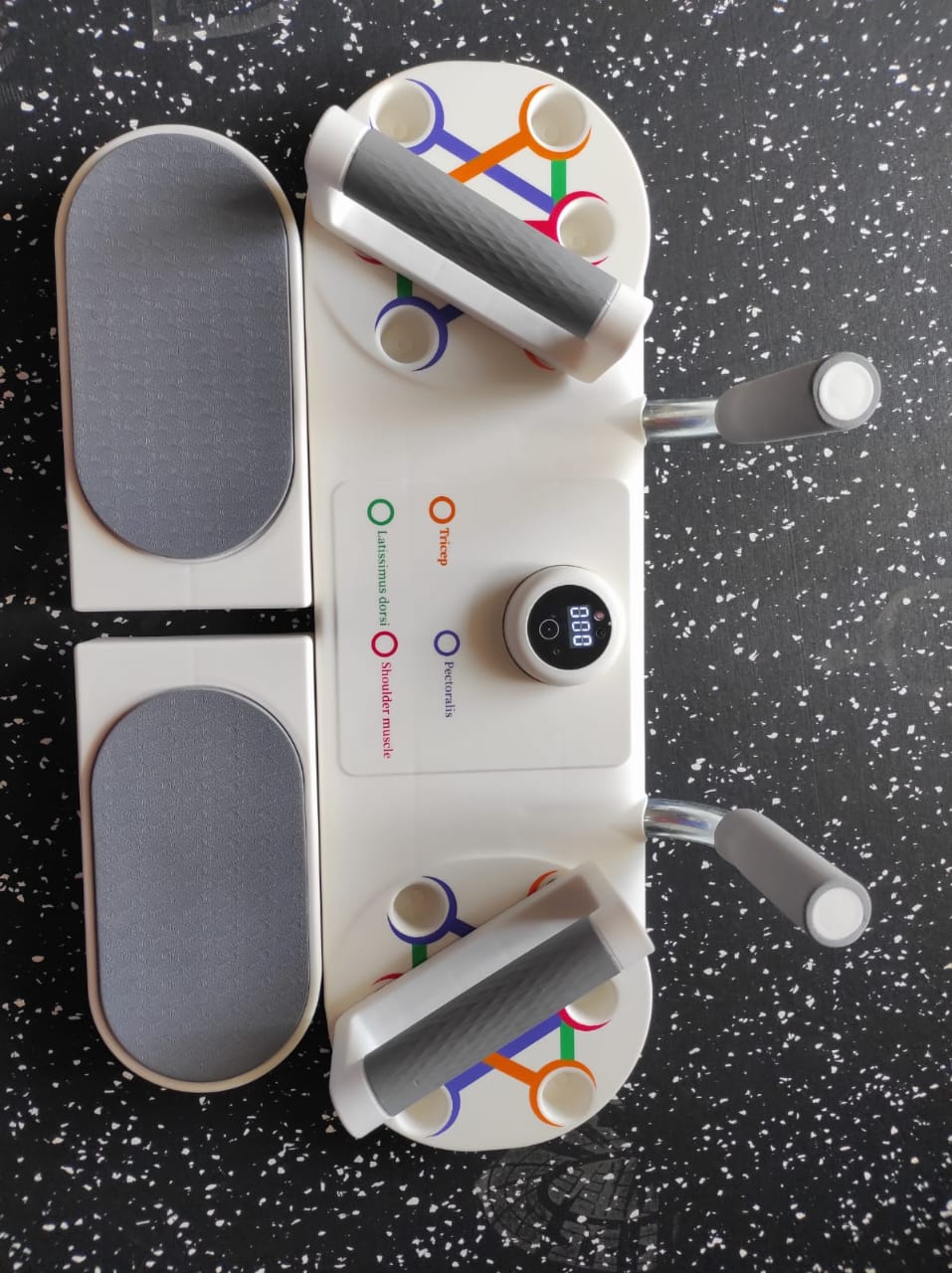 - Works four different muscle groups: shoulders, legs, biceps and abs